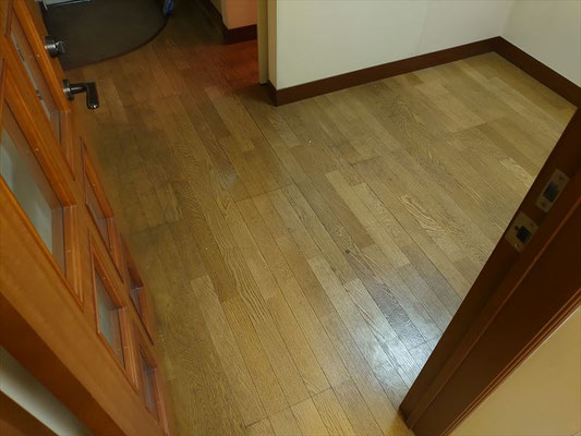 壁に空いた穴は、下地補修を行ったうえでクロスを貼り替え、目立たないように仕上げました。また、ドアの丁番やストッパー位置のズレも修正し、開閉に支障がない状態へ調整。床の表面に傷みが見られた箇所は、リペアにより目立たなく補修いたしました。