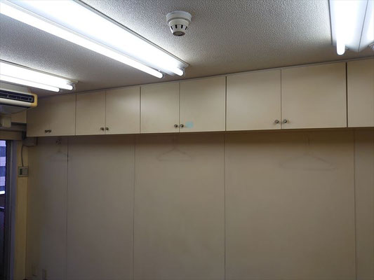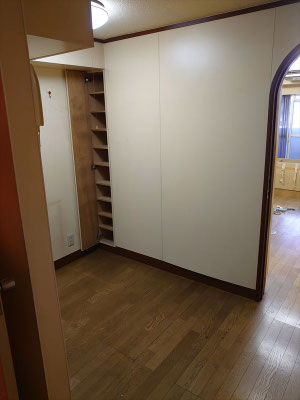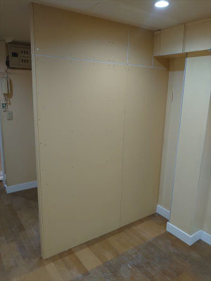 今回は、備え付けの棚を撤去し、新たに壁面造作と建具の取り付け、クロス貼替、さらにダウンライトを新規で設置する内装改修工事を行いました。