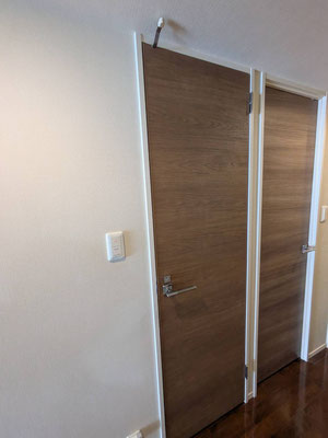 衝突などで開いてしまった穴は、時間が経つほど内部の損傷も広がりがちです。今回は弊社独自の下地処理によって補修範囲の強度を確保しながら、見た目にも違和感のない仕上がりを目指しました。仕上げには既存の木目に近いシートを選定し、貼付け作業を丁寧に実施。施工後はどこに穴があったのか分からないレベルに復旧できました。